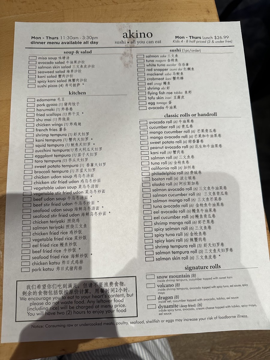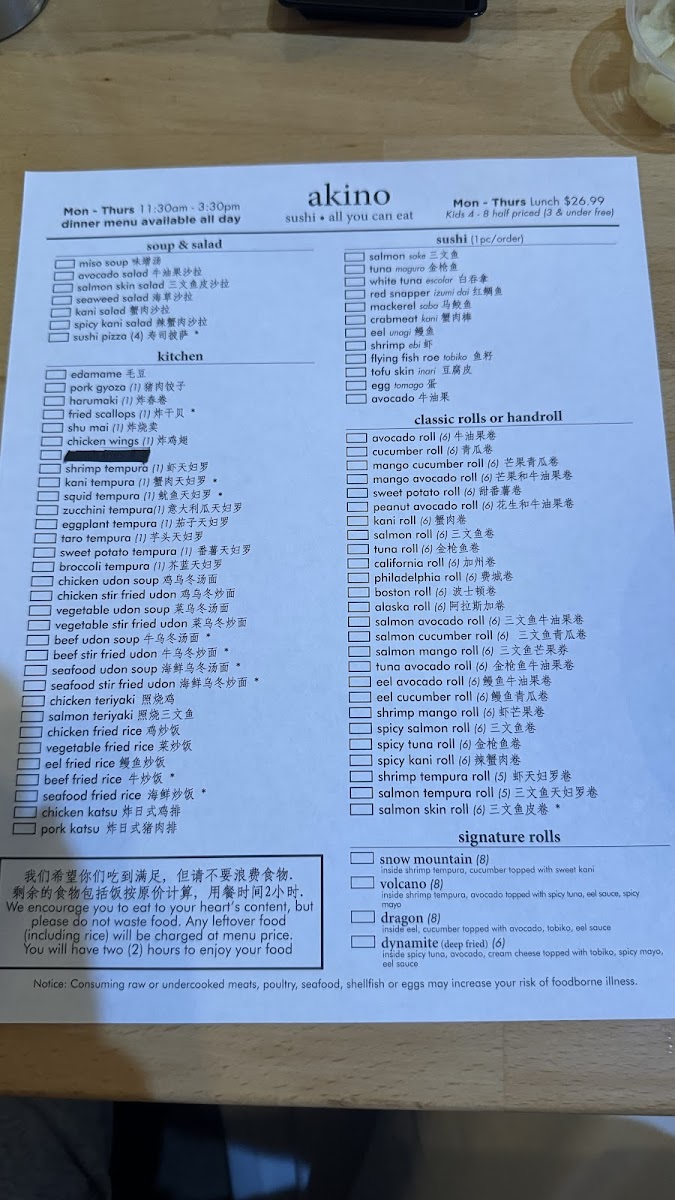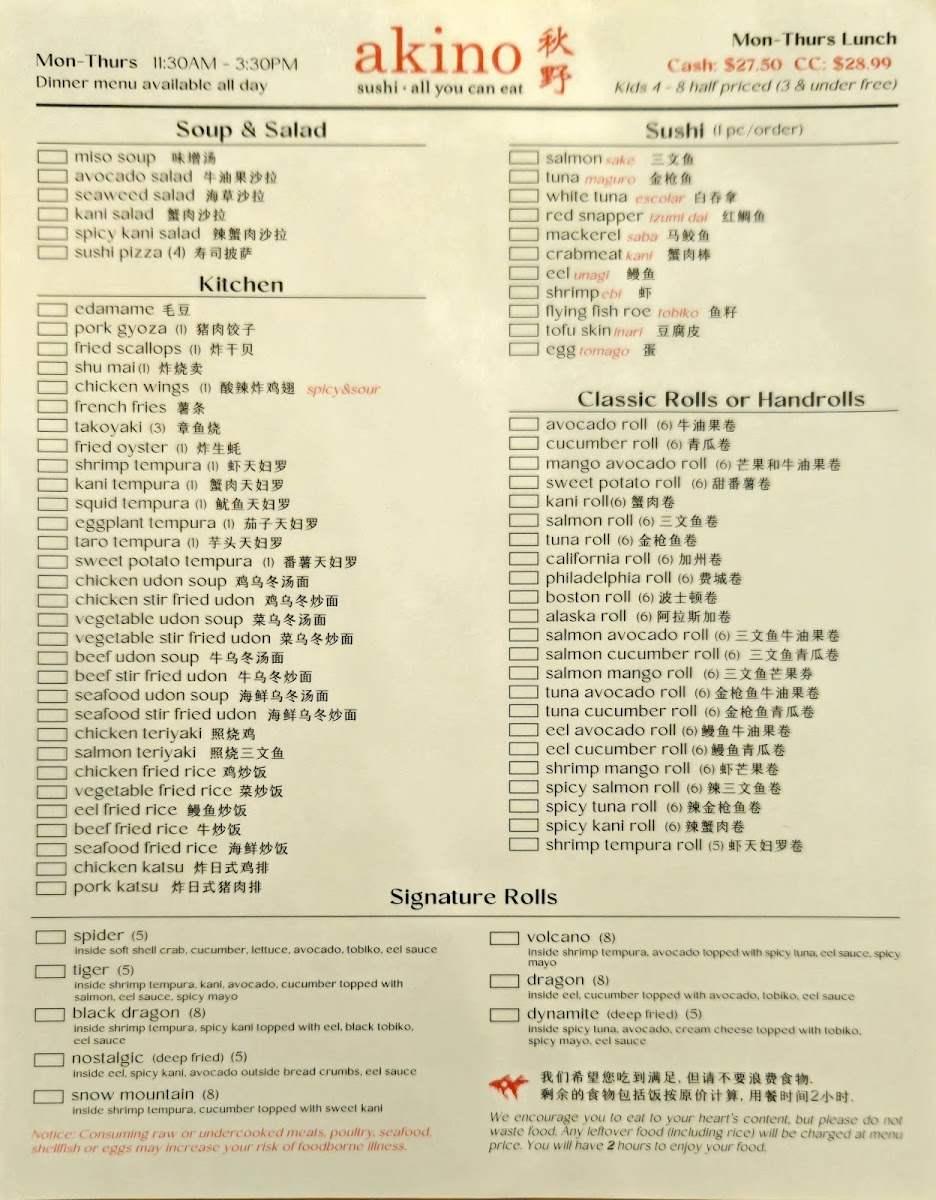 Welcome to Akino, a charming sushi restaurant nestled in the heart of Elmhurst, NY. Renowned for its exquisite all-you-can-eat offerings, Akino presents a diverse menu that delights sushi aficionados and newcomers alike. Highlights include their signature rolls such as the Dreamin, packed with spicy salmon and topped with fresh ikura, and the succulent Rainbow, featuring an assortment of fish atop kani and avocado.